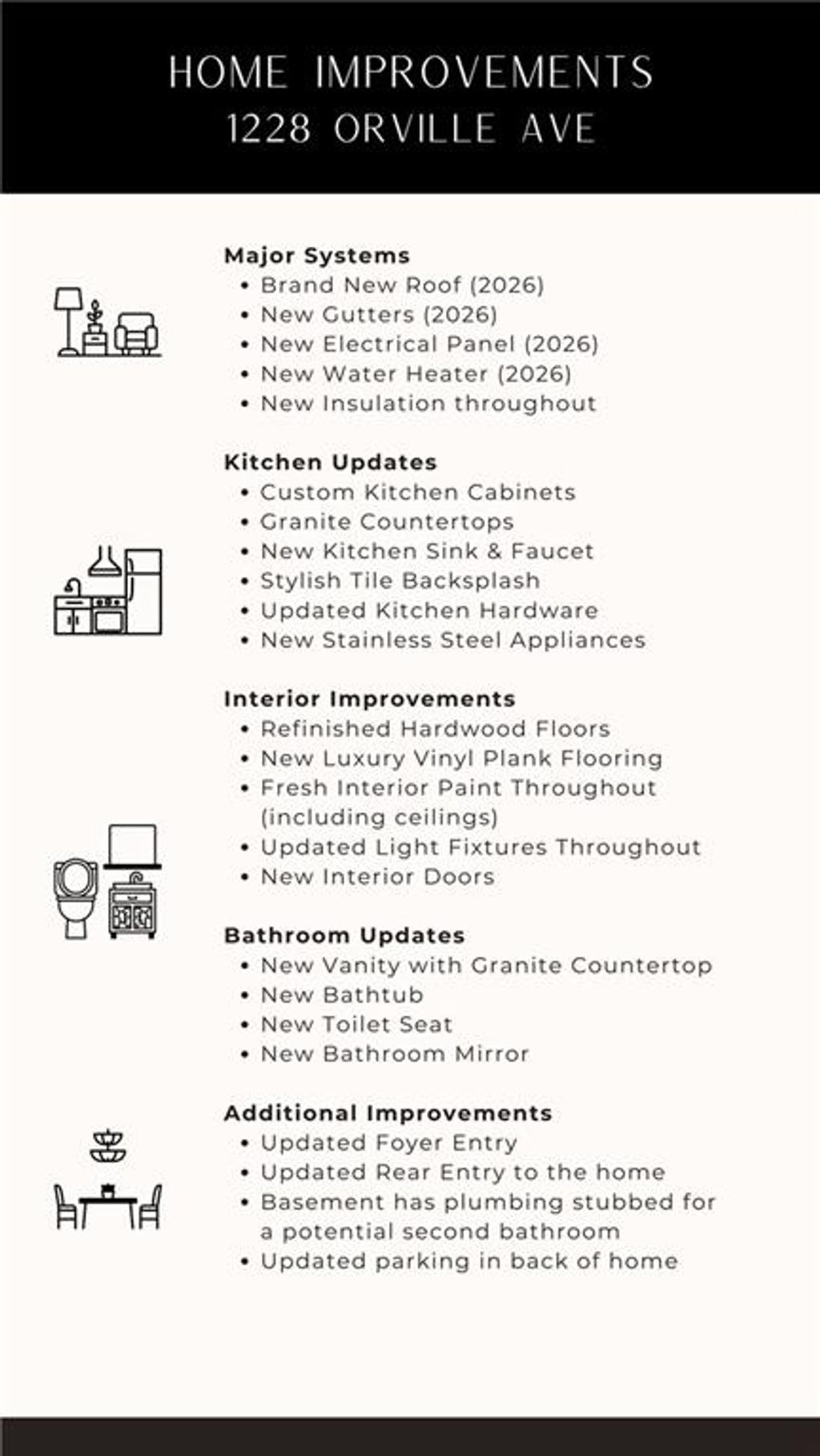 Welcome to 1228 Orville Avenue! This beautifully updated 3-bedroom, 1-bath home offers 1,410 square feet of comfortable living space with thoughtful improvements throughout. Enjoy peace of mind with a NEW roof, gutters, and water heater, along with new insulation, windows, doors, and fresh interior paint. The updated kitchen features brand-new stainless steel appliances, and the home also offers refreshed bedrooms and bathroom with modern finishes. A welcoming foyer adds charm and functionality, while the full basement provides excellent storage or future finishing potential. Did I mention that there is an unfinished bathroom in the basement. Its ready for you to personalize. Outside, you'll love the private parking in the rear and the convenient location just minutes from the highway - making commuting easy while still enjoying a neighborhood feel. This move-in ready home combines major updates, space, and convenience - don't miss your opportunity to make it yours!